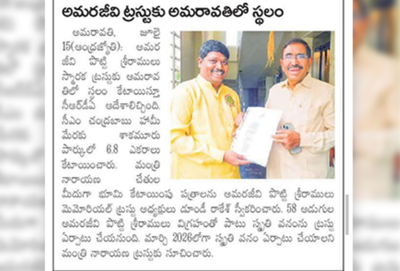 The Andhra Pradesh Government has allocated 6.8 acres in Amaravati for installing a 58-feet bronze statue of Amarajeevi Potti Sreeramulu, honoring his sacrifice for the Telugu-speaking state. The monument will stand as a symbol of unity, pride, and inspiration for generations to come.